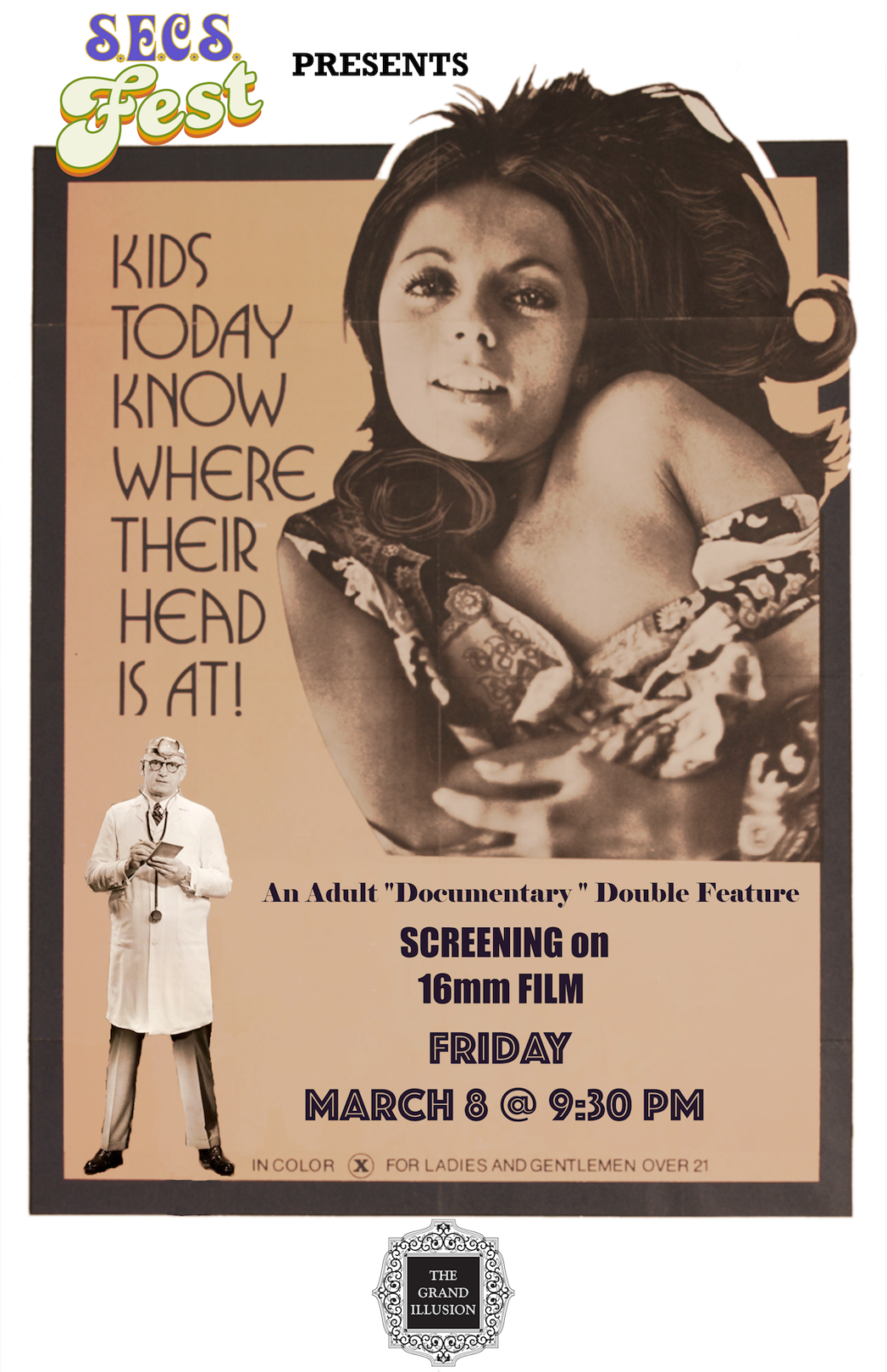 The Seattle Erotica Cinema Society presents a double-feature of early 1970s explicit sexploitation flicks. In white-coater comedic parody, sexologist Doctor Cordova treats the most challenging sexual problems of the new generation of post-sexual revolution youth of the 1970s. Next, Rene Bond introduces a series of erotic vignettes that enact the actual fantasies of youth that are more sexually adventurous and curious than their parents' generation. Featuring Rene Bond, Marc Stevens, and Andrea True.
